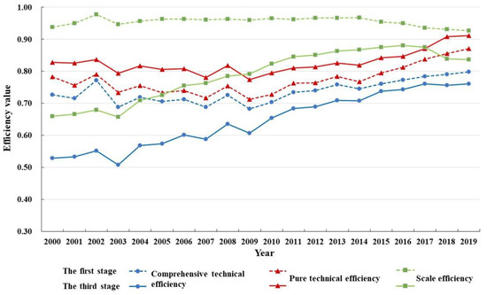 The comprehensive technical efficiency, pure technical efficiency, and scale efficiency of grain production resource allocation in major grain-producing areas of China from 2000 to 2019 in the third stage.