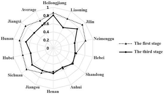 The initial input variables were adjusted according to the analysis results of the second stage, and the adjusted new input variables were brought into the common frontier super-efficiency EBM model again to obtain the utilization efficiency of food production resources in each region in the third stage (see Tables S4–S6). The specific efficiency values and changes are shown in Table 3 and Figure 2 and Figure 3. After comparing the first stage and the third stage, it was found that, after excluding external environmental factors and random errors, the three indicators of resource utilization efficiency of grain production in major producing areas in China had changed greatly from 2000 to 2019, indicating the necessity of the rational adjustment of input indicators.