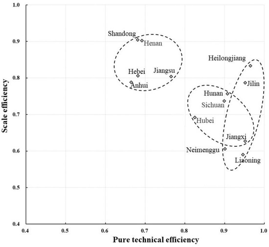 Scatter diagram of pure technical efficiency and scale efficiency after adjustment.