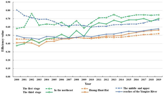 In order to further explore the distribution of the utilization efficiency of grain production resources in different regions, this paper, instead of dividing the research region into eastern, central, and western regions according to the previous economic belt classification standard, combined the characteristics of grain cultivation, natural geographical characteristics, and allocative efficiency level characteristics (the range of dotted lines in Figure 6). Major grain-producing areas were divided into northeast China, the Huang-Huai-Hai region, and the middle and upper reaches of the Yangtze River. The detailed variation trend of the allocation efficiency of food production resources in these three regions is shown in Table 5 and Figure 7. The northeast includes Heilongjiang, Jilin, Liaoning, and Neimenggu; the Huang-Huai-Hai region includes Hebei, Henan, Shandong, Anhui, and Jiangsu; and the middle and upper reaches of the Yangtze River include Jiangxi, Hubei, Hunan, and Sichuan.