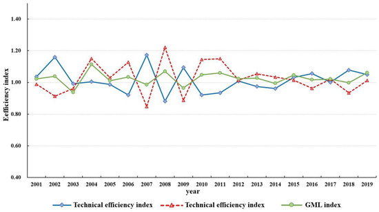 In order to further explore the dynamic changes in production resource utilization efficiency in the major grain-producing areas in China from 2000 to 2019, the GML index model was included in this section, with the aim of showing the changes in resource utilization efficiency of food production by applying total factor productivity. In this section, while measuring the GML index before and after adjustment, it can be decomposed into the technological efficiency change index and technological progress change index to identify the influence degree of both on the dynamic changes in total factor productivity of grain production resources. The former measures the catch-up degree of each decision-making unit to the production frontier border for two consecutive terms, presenting the catch-up effect of resource use efficiency, and it can be further decomposed into pure technical efficiency change and scale efficiency change index change, while the latter measures the mobile cases of the effective frontier during two consecutive periods, presenting the growth effect of resource utilization efficiency. The change index results of decomposition efficiency are shown in Table 6 and Figure 8.