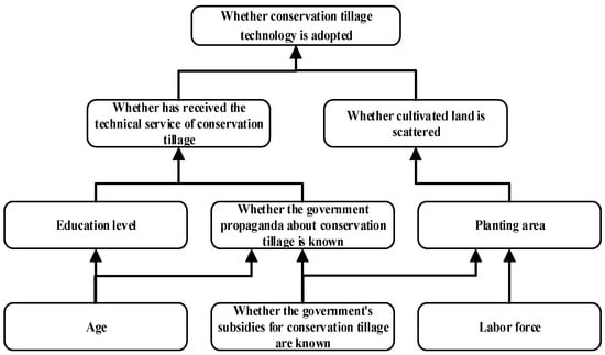 It can be seen from Figure 1 that among the influencing factors of farmers’ black soils protection behavior in Jilin Province, whether farmers have received the technical service of conservation tillage and whether the cultivated land is scattered are the direct factors on the surface; education level, whether the government publicity about conservation tillage is known, and the planting area are intermediate indirect factors; Age, whether the government’s subsidies for conservation tillage are known and the labor force are the deep-rooted factors.