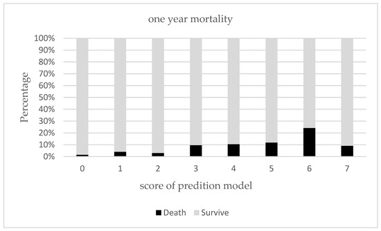 This retrospective study was aimed at identifying mortality risk factors in older patients within one year after discharge from a geriatric ward. Additionally, a prediction model of one-year mortality was also developed based on these risk factors, including age, length of stay, malnutrition, multi-morbidities, and previous admission history. In previous reports, mortality rates were found to be approximately 6% to 22% in older hospitalized patients one year after discharge [24,25]. In our study, the mortality rate was 7.7%, which was approximately equal to the result seen in previous studies. Regarding our patients, the average length of hospital stay was approximately 2 weeks, with a high proportion of these older patients having an issue with polypharmacy. Additionally, our patients experienced a decline in physical function as determined by the Barthel Index, as well as experiencing comorbidities.