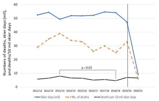 Therefore, the primary aims of the present study were to record the frequency and causes of skiing fatalities in the winter seasons of 2019/20 and 2020/21 and to compare the respective mortality rates with those reported in the years prior to the COVID-19 pandemic.