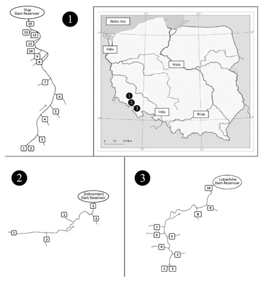 The study covered the following areas in south-west Poland: N 50°38′10.1652″–N 51°4′31.7745″ and E 16°3′54.4715″–E 16°25′1.4097″ [19,20]. The study included three Lower Silesian rivers: Nysa Szalona, Strzegomka and Bystrzyca along with their tributaries from the sources to their mouths in the dam reservoirs Słup, Dobromierz and Lubachów (Figure 1; Table 2, Table 3 and Table 4).