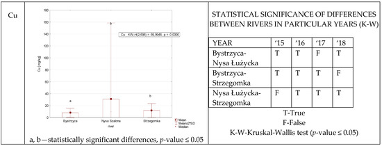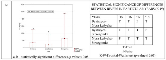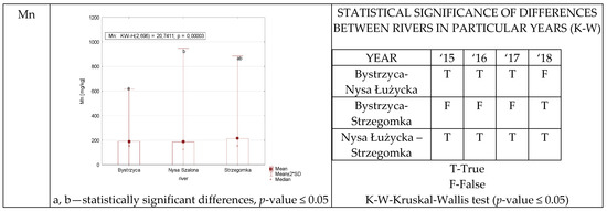 Statistically significant differences in manganese content were noted between the Nysa Szalona and Strzegomka in each year of study (Figure 7). Statistically significant differences were recorded between the Bystrzyca and the Nysa Szalona. The exception was the year 2018, where these differences were not found, exactly the opposite statistical relationship was observed between the Bystrzyca and Strzegomka Rivers.