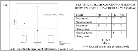 Statistically significant differences in cadmium levels in aquatic plants were found between all rivers only in the last year of the study (Figure 3). In contrast, no such differences were recorded between any rivers in 2016. The multiannual data obtained indicated that both the Bystrzyca and Strzegomka have statistically the lowest cadmium content compared to the Nysa Szalona.