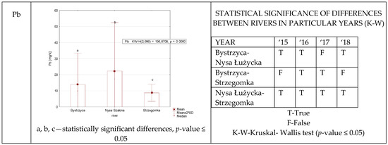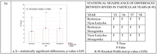 Similar to cadmium, statistically significant differences in nickel levels between plants from different rivers were found in 2018 (Figure 4). In the remaining years, such differences were not observed, although in sum, without division into years, statistical differences were observed between the Bystrzyca, and the Nysa Szalona.