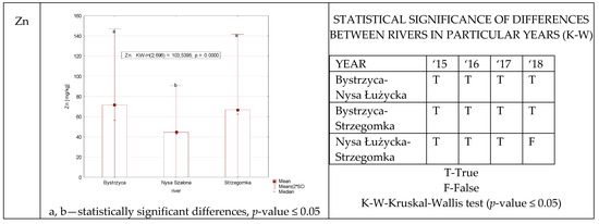 Statistically significant differences in zinc content were recorded with one exception (year 2018, Nysa Szalona and Strzegomka) between all rivers (Figure 6). All the obtained data allowed this study to single out the Nysa Szalona River as the watercourse with the statistically lowest level of zinc.