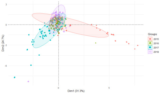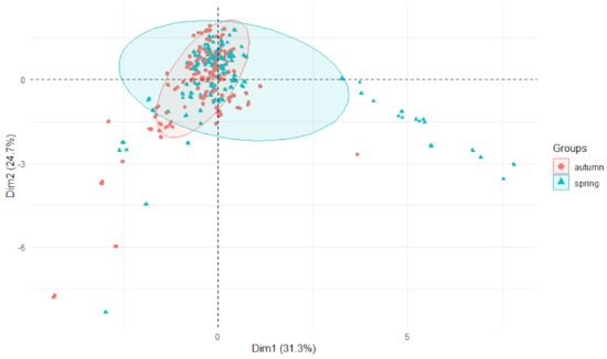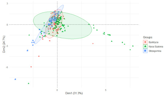 The analysis of results was performed using Microsoft Office Excel 2019 and Statistica 13.0 (StatSoft Poland, Krakow, Poland). Calculations were performed using R version 3.6.0. The Shapiro-Wilk test was applied to check the normality of the distribution. Spearman correlations were used due to the distribution of samples. Spearman correlations were calculated in Statistica, and box and whisker plots were also created in this program. All statistically significant differences were calculated at p < 0.05. Because the data had a non-normal distribution, the Kruskal-Wallis test with post-hoc analysis was used. A PCA test using the r-groups statistic (RStudio Version 1.1.442-© 2022–2018, Rstudio, Inc., Boston, MA, USA) was used to visualize differences between groups. It was based on all data and presented the differences in the parameters of the studied plant depending on the year, season of study and river.