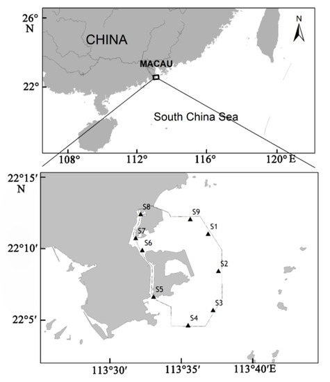 The study was conducted in nine fixed locations in Macau waters from 30 December 2019 to 1 January 2020 (Figure 1).