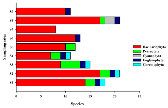 Phytoplankton species of different taxa detected in the different sampling sites.