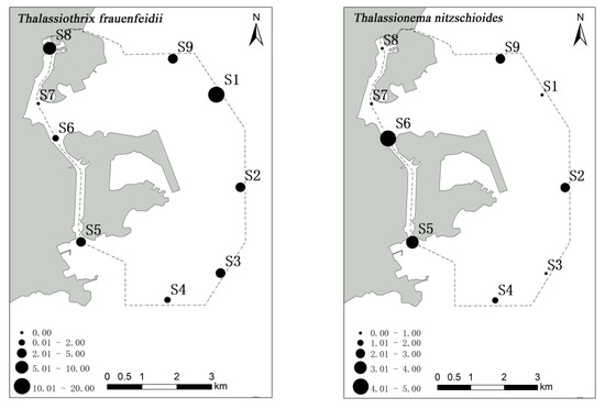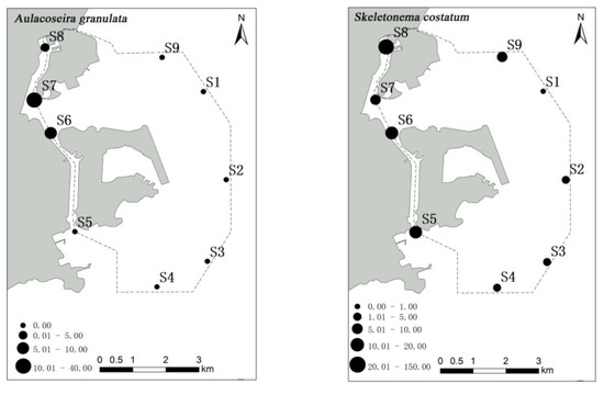 A. granulata, S. costatum and T. nitzschioides were found in high abundance mainly in the Qianshan and Shizimen waterways, while a high abundance of T. frauenfeidii was detected in the northeast sea area near Macau airport (Figure 4).