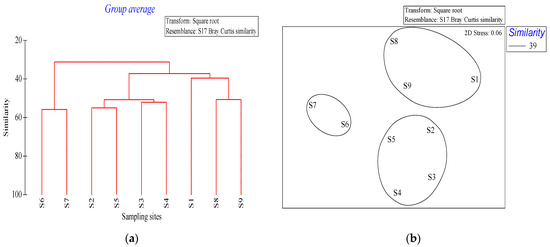 Cluster and NMDS analysis of phytoplankton structure in the waters around Macau examined in December 2019. (a) Cluster analysis of Bray-Curtis similarity indices of different sampling sites. (b) NMDS based on the Bray-Curtis similarity ordination (2D stress = 0.06). Ellipses around the clusters indicate the standard deviation of point scores based on sample-group clusters.