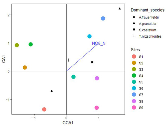 BIOENV analysis of the phytoplankton community and eight physical and chemical factors in the waters around Macau showed that nitrite nitrogen (correlation: 0.5544) was the environmental variable that had the greatest impact on the phytoplankton species matrix (Mantel test: statistic 0.4196, p = 0.009) (Table 6). VIF analysis, excluding the insignificant factors, revealed that nitrite nitrogen had a significant effect on the phytoplankton community in the waters around Macau (VIF = 82.28, F = 2.11, p < 0.01) (Figure 6).
