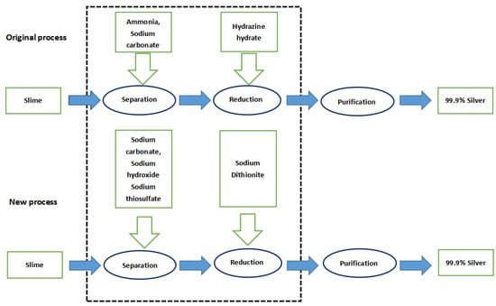 The case selected is a metal recycling company located in Jiangxi Province, China. It is a high-tech environmental protection enterprise that specializes in producing black copper, electrolytic copper, nickel sulfate, electrolytic zinc, and precious metals from copper-containing recycling materials such as electronic waste and electroplating sludge; and recovering rare and precious metals, such as gold and silver, from copper anode slime. The company has a designed annual production capacity of 100,000 tons of refined copper and 1500 tons of anode slime, and 90 kg of recovered metallic silver. The production technology is highly representative. This paper introduces the production technology and input–output items of the former ammonia silver separation technology and the new sodium thiosulfate technology developed by the Institute of Process Engineering.