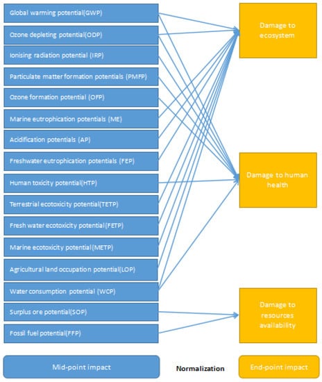 Using LCA-ReCiPe 2016 [] characterization and normalization method system (mid-point and end-point method) weighted addition, the life cycle list is further converted into impact marks in different areas. ReCiPe 2016 can be regarded as a combine of two models: the mid-point indexes of CML and the end-point indexes of eco-indicator are adopted, so the eco-environmental impact of the production processes can be demonstrated by the evaluation results more comprehensively. Compared with the earlier versions, the parameter setting in ReCiPe 2016 shows significant global applicability. The method considers 16 mid-point indexes. On this basis, the 16 mid-point indexes are converted into three categories of end-point indicators through mid-point-to-end-point conversion. Finally, according to the ratio of each indicator value to the global average value, all indicators are normalized to obtain comparable normalized indicator values (Figure 2).