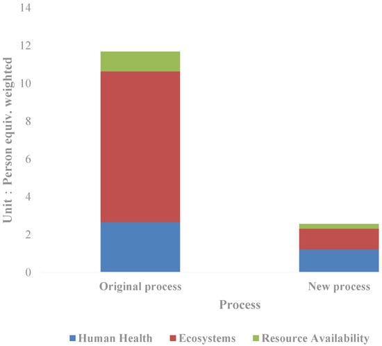 Through normalization, the total value of the eco-environmental impact is obtained as follows (Figure 3): The weighted person equivalent in the new process is 2.56, equal to 21.94% of that in the original process. To be specific, the human health impact equivalent is 1.22, the ecological impact equivalent is 1.09, and the resource availability impact equivalent is 0.25. The corresponding values of the original process are 2.67, 1.97, and 1.05. Compared with the new process, the ecological impact decreases the most, to only 13.72% of the original process; followed by resource availability, equal to 23.73% of the original process; even as for the human health impact, it decreases by more than half in the new process, equivalent to 45.78% of the original process. From the perspective of the new process itself, the greatest impact on the resources and environment is the human health impact, accounting for 47.06% of the total weighted human equivalent, followed by the ecological impact. Furthermore, the impact is mainly divided into climate change, photochemical smog and ionizing radiation, which account for 37.23%, 17.87%, and 13.38% of the total equivalents respectively. The sum of the three items exceeded two-thirds of the total impact on the resources and environment, which is a key area that needs attention in future technology improvement.