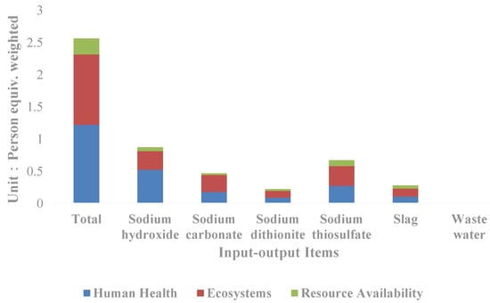 In terms of each input–output item (Figure 4), it can be seen that sodium hydroxide is the input–output item with the greatest impact on the resources and environment, and the weighted person equivalent reaches 0.87, accounting for 33.98% of the total equivalent, followed by sodium thiosulfate and sodium carbonate, which account for 26.10% and 18.30% of the total equivalent respectively. By classification, sodium hydroxide contributes to the greatest impact on human health, accounting for 42.90% of the total human health impact; followed by sodium thiosulfate and sodium carbonate, accounting for 22.25% and 14.66% respectively. Sodium thiosulfate contributes to the greatest impact on the ecological and resource availability, accounting for 28.47% and 34.61% of the total respectively, followed by sodium hydroxide and sodium carbonate.