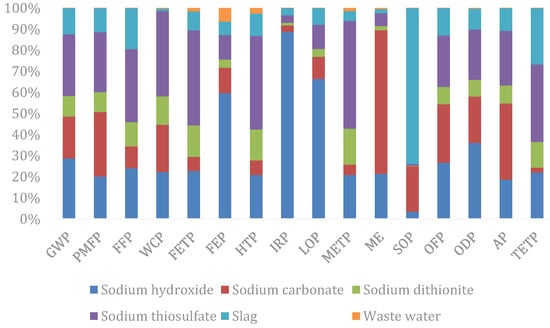 In terms of each impact factor (Figure 5), sodium thiosulfate exerts the greatest impact in the field of GWP, PMF, FFP, WCP, FETP, FEP, METP, OFP, AP, and TETP; sodium hydroxide exerts the greatest impact in the field of ionizing radiation, land use changes, and ozone depletion; solid waste disposal is the largest cause of metal consumption, while wastewater treatment causes the greatest impact on seawater eutrophication.