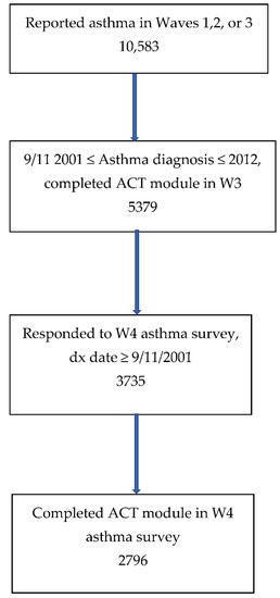 The WTC Health Registry (WTCHR) is a closed, longitudinal cohort of rescue/recovery workers, volunteers, local area workers, residents, students, teachers, and passersby who met criteria for exposure to the disaster on or after 11 September 2001 [20]. A total of 68,046 adults aged ≥18 on 11 September 2001 responded to the first registry survey (Wave 1 or W1, 2003–2004). To date, four surveys have been completed, with 46,019 enrollees responding to the second survey (Wave 2, 2006–2007), 42,395 responding to the third survey (Wave 3, 2011–2012), and 35,958 responding to the fourth survey (Wave 4, 2015–2016). These surveys asked about demographic characteristics, exposure to the disaster, physical and mental health status, self-report of diagnosed illnesses, social status, and quality of life. The W3 survey included an asthma module that inquired about symptoms, diagnosis date and control level using a modified version of the Asthma Control Test (ACT) [21,22].