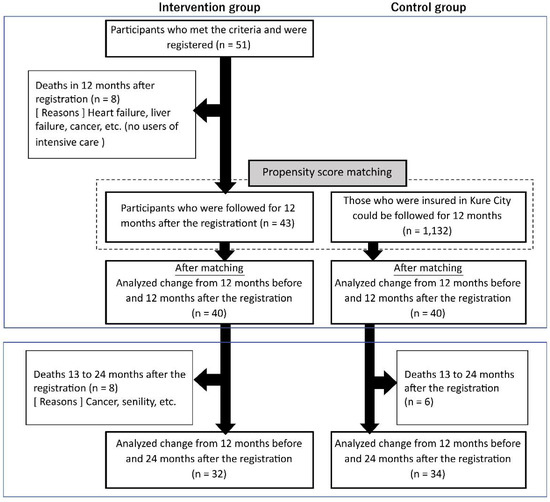 For the CMG, participants who met the eligibility criteria were selected from health insurance claim data or referrals from healthcare professionals, and their consent to participate in the study was obtained. For the CG, Kure City provided an opt-out on its public information website regarding the implementation of this joint research. Thereafter, the authors received the health insurance claim data from Kure City in a form that excluded personal information and used the data to register those who met the eligibility criteria.