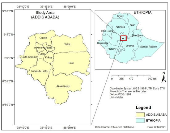 Addis Ababa is the capital city of Ethiopia and is located on latitude 90°1′48″ N and longitude 38°44′24″ E (Figure 1). The city lies at the foot of Mount Entoto with an elevation of 2355 m above sea level and covers about 540 km2. Addis Ababa hosts the headquarters of the African Union (AU) and the United Nations Economic Commission for Africa (UNECA). The city is divided into 10 sub-cities without newly added sub-city: Addis Ketema, Akaky Kaliti, Arada, Bole, Gullele, Kirkos, Kolfe Keranio, Lideta, Nifas Silk-Lafto, and Yeka [32]. According to 2015 estimates by the Central Statistical Agency (CSA), the total population of Ethiopia was about 90 million. Addis Ababa is home to an estimated 3,434,000 inhabitants, which is 3.6% of the national population and 18% of the total urban population of Ethiopia. The city has a population density per square kilometer of 6516 people. The population growth rate of Addis Ababa is around 2.1 percent per annum, with a projected population of 4.7 million people by 2030 [32]. Addis Ababa lies between 2200 and 2500 m above sea level. Due to its high altitude, Addis Ababa encounters a humid subtropical warm summer climate, which is mild with dry winters, mild, rainy summers, and moderate seasonality. The average annual temperature range is 10 °C to 24 °C. From February to May, the city has a short rainy season with a long wet season from June to mid-September [32].