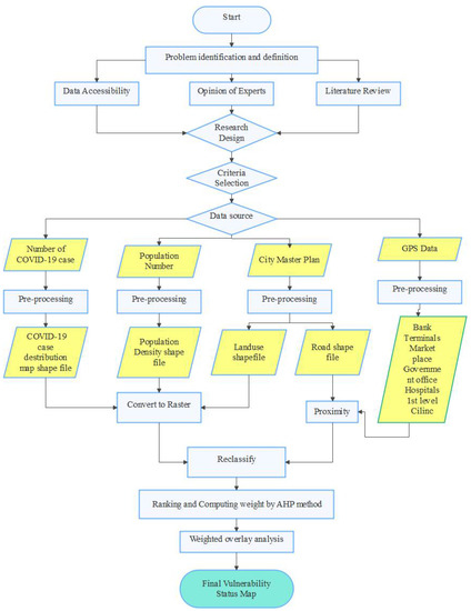The primary step was setting the goal of defining the problem and setting the research design. In this study, GIS-based MCDA aims to produce a map showing the vulnerability status of infection risk of COVID-19 in Addis Ababa city. The following step was determining factors/criteria that are important for COVID-19 vulnerability status evaluation. It is important to choose the appropriate influential factors as their quality affects the validity of the results [33]. Since no adequate previous studies of the vulnerability status of an area to COVID-19 infection risk have been conducted, the selection of influential factors is a very challenging task. Besides, no universal factors are accepted for mapping and evaluating the vulnerability status of COVID-19 infection risk. In such circumstances, vulnerability factors can be identified by either collecting data from a literature review or prior knowledge of the phenomena. Ongoing research on pandemics has shown that local and community-wide transmission of the virus occurs mainly in public places where most people are likely to come into contact with the greatest number of possible infection carriers [34]. Evaluating the vulnerability status of infection risk of COVID-19 in Addis Ababa was selected mainly based on prior knowledge of the property of the pandemic and available literature review [15,35], which includes Landuse, Population density, distance from roads, distance from hospitals, distance from bus stations/terminals, distance from the bank, distance to Markets, number of people with COVID-19, distance to health care unite, and distance to government offices. These datasets were collected from various sources and processed using ArcGIS software for MCDA.