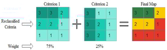 Step five was to aggregate the criteria using weighted overlay analysis. Validating the result was the final step. In overlay analysis, different layers were overlaid together with their weights to generate a vulnerability status map using the weighted overlay tool. The weights assigned to the criteria represent the strength of influence of each criterion within the scenario. The values of each pixel from each criterion are multiplied by its corresponding weight (Figure 3). This is repeated for each criterion; the resulting values are added and then rounded to the nearest integer before assigning them to each pixel to obtain a final vulnerability status map. The lower the cumulative value for each pixel within the scenario, the lower the vulnerability. Conversely, the higher the cumulative value for each pixel, the higher the vulnerability.