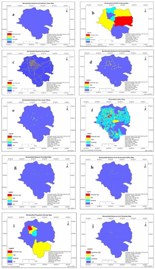 Standardized factors: Market place (a); COVID-19 case till 24 March 2021 Terminals (b); d-Road (c); Hospitals (d); Lower Clinics (e); Land use (f); Banks (g); Government office (h); Population density (i); Terminals (j).