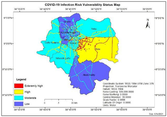 Using the weight of Factors from the pair-wise comparison eigenvectors and the reclassified factors layer as an input, four areas of COVID-19 infection risk vulnerability were obtained for weighted overlay analysis in ArcGIS, as shown in Figure 5. The result showed that out of the total study area, 32.62% (169.91 km2) fall under Low vulnerable (1), and the area which covers 40.9% (213.04 km2) is under moderate vulnerable class (2) for infection risk of COVID-19. The highly vulnerable (3) covers an area of 25.31% (132.87 km2), and the remaining 1.17% (6.12 km2) is under an extremely high vulnerable class (4). The result allowed defining areas with extremely high vulnerability; most areas are located in the central part of the city, such as Bole and Megenagna, where most of the establishments for public use are located. However, due to the conditions of the criteria, it is possible to observe large areas scattered throughout the city, covering different urban sectors. The areas are characterized by high vehicle-pedestrian traffic. The areas with high vulnerability are delimited mostly in the Bole sub-city. Hence, the area is characterized by a high number of COVID-19 confirmed cases in the city, according to the city health bureau’s report. The area with high vulnerability is also delimited by the main road around most parts of the city. The area of moderate vulnerability is located in the western, northeastern, and partially central parts of the city without a defined pattern. Finally, low vulnerability zones presented a more stable pattern in the northern and southern parts of the city. Despite having the highest surface percentage, not being close to or immersed in points of high confluence means that these areas are not risky and can be passable by applying prevention measures and security established by local governments. Hence, the maps were constructed to allow targeting intervention within the city according to the vulnerability gradient. Thus, these priority zones could regularly address pandemic control mechanisms like disinfection.