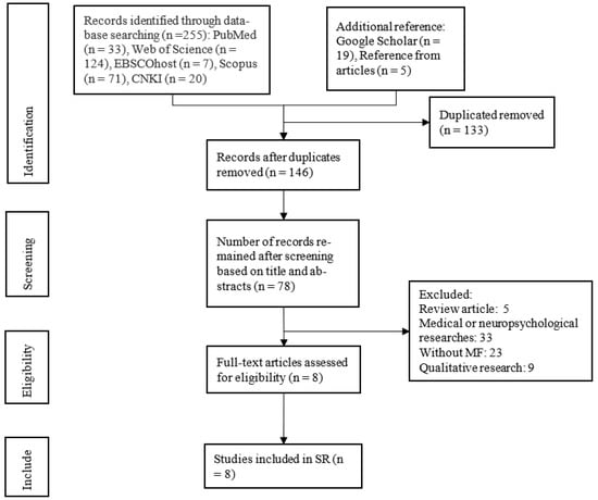 PICOS (population, intervention, comparison, outcome and study designs) criteria were used as the inclusion criteria (see Table 1). Studies were required to fulfill the following five inclusion criteria: (1) MF was observed in participants; (2) studies published in English with the application of MBI, regardless of population characteristics, such as age, gender, and ethnicity; (3) randomized controlled trials (RCTs), non-randomized controlled trials (nRCTs) and non-randomized non-controlled trials (nRnCTs) with two or more groups and single-group trials; (4) MBI was used for intervention; (5) comparison was made without MBI and MF-inducing possibility. The exclusion criteria were as follows: (1) systematic review; (2) medical or neuropsychological studies.