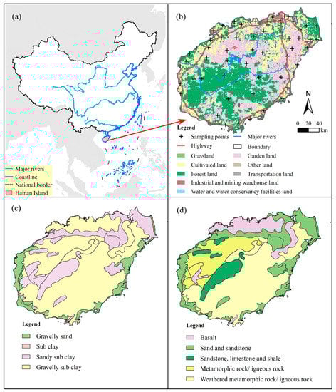 (a) The location of the study area in China; (b) the sampling sites’ distribution and land use classification; (c) the soil media and (d) the aquifer media in Hainan Island.