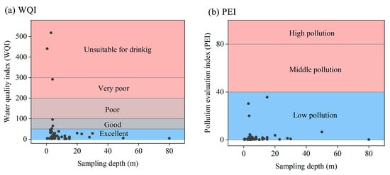 Classification of groundwater in Hainan Island based on (a) water quality index (WQI) and (b) pollution evaluation index (PEI).