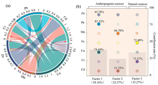 Source analysis of heavy metals in groundwater by combing (a) Pearson correlation analysis and (b) absolute principal component scores/multiple linear regression (APCS/MLR). (The width of each heavy metal is shown to denote the correlation coefficient. The red arrow denotes a negative correlation between two heavy metals. The histogram is used to represent the percentage of each factor. Different color gradients are used to indicate the proportions of each heavy metal to the different factors.).