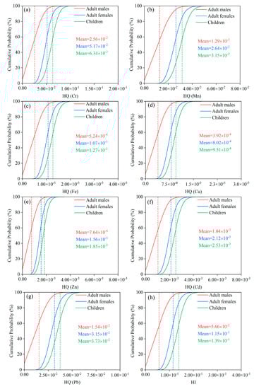 For HMs in the water environment, ingestion and dermal contact play the most important role []. In this study, the health risk of different populations (adult males, adult females and children) through ingestion and dermal contact of exposure pathways to HMs was assessed using the HRA model as recommended by the United States Environmental Protection Agency (USEPA). In addition, adults are considered as the general population and children as the sensitive group. Based on previous studies, seven HMs were classified as non-carcinogenic (Mn, Fe, Cu, and Zn) and carcinogenic (Cr, Cd, and Pb) elements [,], respectively.