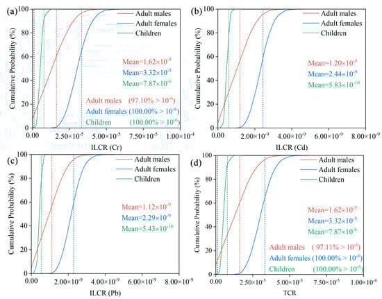Probability distribution and the percentage of incremental lifetime cancer risk (ILCR) values surpassing 1.00 × 10−6 for (a) Cr, (b) Cd, (c) Pb, and (d) to the total cancer risk (TCR). (The red, blue, or green dashed vertical lines represent the mean values, whereas the black is the acceptable carcinogenic risk value of 1.00 × 10−6.).