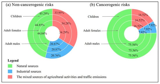 The result of APCS/MLR model was adopted to quantify the contribution of different sources to the health risks. The health risk values of individual HMs were multiplied by the contribution rates of identified sources to obtain the health risks caused by the different sources. For adult males, adult females and children, the contribution of different pollution sources to both the non-carcinogenic and the carcinogenic health risks shows the same trend, i.e., natural sources > the mixed sources of agricultural activities and traffic emissions > industrial activities (Figure 6). In the case of children, the contribution rates of the mixed sources of agricultural activities and traffic emissions, industrial activities and natural sources to the non-carcinogenic risk are 33.95, 20.76 and 45.29%, respectively, and the contribution rates to the carcinogenic risk are 16.52, 7.92 and 75.56%, respectively. Natural sources contribute the most to the health risks, manifesting that the geological background of Hainan Island influences the concentrations of HMs to a certain extent. In general, the contribution rate of soil parent material is higher than other sources. For example, HMs in soil are relatively high due to higher toxicity coefficients and higher Cr from soil material []. HMs in soil penetrate into groundwater reserves through rainfall and irrigation [], leading to increased health risks of HMs in the groundwater.