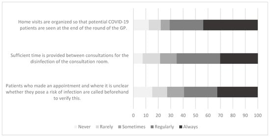 With regard to whether sufficient time wass provided between consultations for the disinfection of the consultation room, 65.3% stated that sufficient time wass provided always or regularly, in contrast to 21.5% reporting that it happened rarely or never (Figure 1). Using logistic regression, the practice population size remained the only significant explanatory variable (p < 0.001), with a decreasing proportion reporting sufficient time to disinfect rooms as the population size increases.