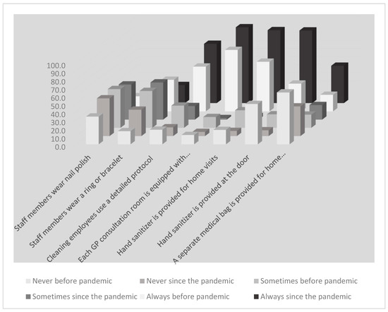 We identified a considerable improvement in practices with more practices reporting that staff members never wore nail polish (increased from 34% to 46.2%); more practices reporting that staff never wear a ring/bracelet (increased from 16.1% to 32.3%) during the COVID-19 pandemic period; and more practices using a cleaning protocol (increased from 54.9% to 72.7%) (Figure 2). The availability of sanitizer in consultation rooms, for house calls, and at the practice door for patients all increased from 75.3%, 60.8%, and 34% to 93%, 89.5%, and 89.1%, respectively, during the pandemic. Prior to the pandemic, 63.7% of practices did not provide a separate medical bag for home visits to patients with suspected infection, but this rate dropped to 36.4% during the pandemic period.