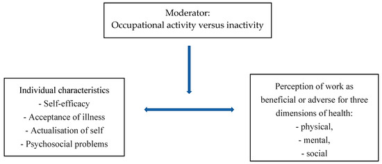 Based on the existing studies and given that a number of questions have not yet been answered, this study was undertaken to determine in a group of chronically ill persons how having or not having a job moderates the association between a chronically ill person’s individual characteristics (self-efficacy, acceptance of illness, actualisation of self, and psychosocial problems) and their perception of work as health beneficial or health adverse (Figure 1).