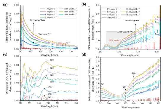 DOC-normalized differential and ln-transformed spectra of the PPFA induced by Fe(III) at varying concentrations. (b,d) are enlarged details of (a,c), respectively. The concentration of PPFA is 47.7 mg·L−1 and the Fe(III) concentrations range from 1.75 to 18.00 μmol·L−1.
