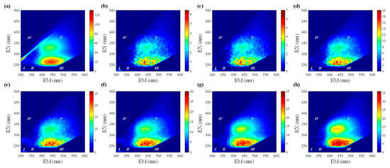 - Sun, J.; Guo, L.; Li, Q.; Zhao, Y.; Gao, M.; She, Z.; Jin, C. Three-dimensional fluorescence excitation–emission matrix (EEM) spectroscopy with regional integration analysis for assessing waste sludge hydrolysis at different pretreated temperatures. Environ. Sci. Pollut. Res. 2016, 23, 24061–24067. [Google Scholar] [CrossRef] [PubMed]