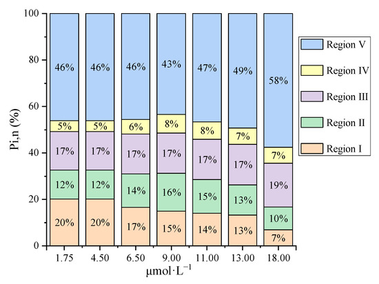 To quantify the proportion of iron binding with the different fluorophores, the differential fluorescence EEM spectra between the initial bulk PPFA and the PPFA after bound with iron combining FRI analysis were calculated. The ΔEEM landscapes of PPFA after the addition of 1.75, 4.50, 6.50, 9.00,11.00,13.00 and 18.00 μmol·L−1 of iron, in comparison with those without the addition of iron at pH 2.0, are shown in Figure 2. The fluorescence intensities of PPFA were quenched with increasing iron concentrations in the region of peak A and peak C. More significant quenching was noticed in the peak A fluorescent region and higher concentrations of iron addition. In comparison to the UV-Vis spectra absorbance, the quenching intensity of each peak in EEM fluorescence spectra is still enhanced at 18.00 μmol·L−1 concentration. Fluorescence regional integration (FRI) analysis was applied to divide the ΔEEM spectra into five different Ex/Em regions [59]. From Figure 2, the ΔEEM caused by iron mainly focused on Region V (EX/EM 250–450/380–550 nm), indicating that iron significantly quenched the fluorescence intensity in the EEM region associated with humic-like acids. With the addition of iron, Pi,n occurring in Region V increased from 46% to 58%, showing higher concentrations generally possessed a stronger binding capacity with humic substances (Figure 3). In comparison with high iron concentrations, it can be found that Region I and Region II occupied relatively larger proportions, indicating that simple aromatic proteins were involved in the binding of Fe(III) and PPFA at low iron concentrations. Previous studies also showed that the contribution of humic acid substances is greater for iron and protein-like substances account for a minor proportion in wetland DOM [40].