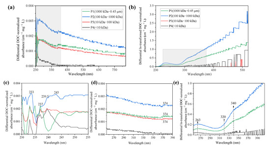 DOC-normalized differential and ln-transformed spectra of the PPFA induced by Fe(III) at varying molecular weight. (c,d) are enlarged details of (a), (e) is enlarged details of (b). The addition of iron concentrations for P1–P4 were 10.80, 10.07, 10.13 and 10.30 μmol·L−1.