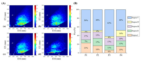 (A) ΔEEMs of different MW PPFA fractions binding with Fe(III) and fluorescence region integration (FRI) results with the addition of iron. (a) P1; (b) P2; (c) P3; (d) P4. (B) The percentage of contribution of different regions in ΔEEM for different MW PPFA fractions.