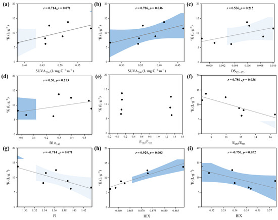 Spearman’s rank correlations between cK and PPFA optical parameters, including (a) specific UV absorbance at 254 nm (SUVA254), (b) specific UV absorbance at 260 nm (SUVA260), (c) DS325–375, (d) DLn350, (e) E250/E203 (f) E250/E365, (g) fluorescence index (FI), (h) humification index (HIX) and (i) biological index (BIX).