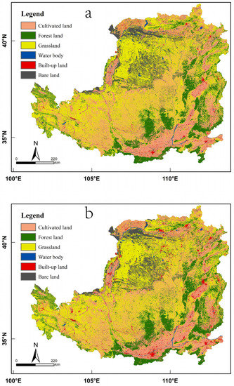 The land use data were obtained from the Data Center for Resources and Environmental Science, Chinese Academy of Sciences, and included two periods, 2000 and 2018, with a spatial resolution of 30 m (https://www.resdc.cn/ (accessed on 5 May 2022)). The dataset was based on 2000 Landsat7 ETM+ and 2018 Landsat8 OLS_TIRS remote sensing images, generated by manual visual interpretation and later corrected for errors through field verification. The final land use data accuracy can reach more than 93% [63,64]. According to the classification criteria of land use types in the project of “Remote Sensing Macro Survey and Dynamic Research on China’s Resources and Environment” [65], the land use types of the Loess Plateau are classified into six categories: cultivated land, forest land, grassland, water body, built-up land and bare land.