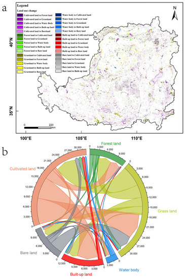 (a) Spatial patterns of land use change on the Loess Plateau during 2000–2018. (b) Land use quantity transfer chord diagram of the Loess Plateau during 2000–2018.