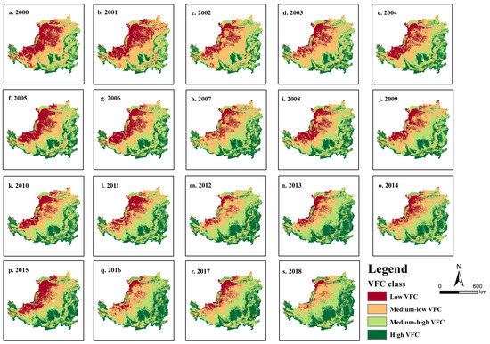 Spatial distribution of VFC in the Loess Plateau from 2000 to2018.